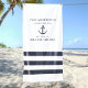 Nautical beach towel features a coastal style boat anchor and stripes design. Personalise the custom text with a family last name and beach house (or other title) with the year established and location. Hale navy blue and cotton white colour scheme.