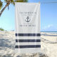 Nautical beach towel features a coastal style boat anchor and stripes design. Personalise the custom text with a family last name and beach house (or other title) with the year established and location. Hale navy blue and sea salt colour scheme.