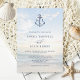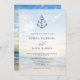 This nautical wedding invitation features an anchor monogram at the top and classic elegant text, over a faded beach scene background.