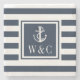 Elegant personalised initials monogram coaster featuring an anchor and navy blue and white striped pattern with your monogram initials set in a navy blue-bordered square. Designed by Thisisnotme©