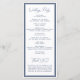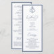 This elegant nautical wedding program features an anchor monogram at the top with the initials of the bride and groom, with a navy blue double frame, a white background and navy blue classic elegant text with script calligraphy.