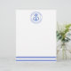 NewParkLane - Personalised Letterhead, with a navy blue striped pattern and a blue watercolor anchor in a circular frame, containing your names and wedding date & place. A fun, modern design for a nautical themed wedding celebration!