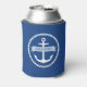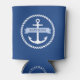 Can cooler featuring a white nautical anchor surrounded by a rope border on a dark blue background. Across the anchor is a light blue ribbon with a template field for your boat's name.