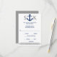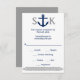 A nautical themed wedding invitation response card in navy and grey. An anchor is at the top of the invitation, with the bride and groom's initials on either side. At the bottom is a grey coloured braided rope design. The back is a solid grey with a navy anchor in the corner.