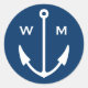 Nautical anchor stickers with monogram. Cute idea for maritime theme Birthday party or baby shower. Personalizable with elegant name initial letters. Navy blue background with white anchor aweigh symbol.