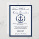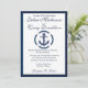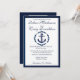 A Nautical Theme Wedding Invitation with Anchor on a White Background with Navy border, highlights and text. The reverse is a Navy background with white banners and text. To personalise, simply insert your details using our easy template, replacing the sample text. Be sure to view the matching cards and accessories to this Nautical Anchor Theme Wedding Collection.