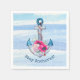 Floral bouquet on nautical anchor with wavy watercolor striped background.