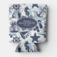 This can cooler features a fun summer pattern of nautical elements including anchor, seagull, starfish and many more, all in navy blue with swirls and wavy aqua blue accents. Add your name and/or other text using the provided template. Search ID839 and ID840 to see other products with this design and additional colour options.