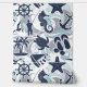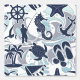 A fun beachy pattern of nautical elements including anchor, seagull, starfish and many more, all in navy blue with swirls and wave aqua blue accents. Create beach house or bathroom decor with this eye-catching original pattern. Search ID839 to see other products with this design.