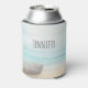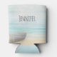 Personalised can coolers with a beautiful rustic image. Subtle colours of light blue, sandy brown and gentle white. A beach scene with a boat on the shore with a fishing net hanging off the side. An elegant shabby look.