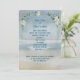 Flowers in nautical netting frame on watercolor ocean background for wedding invite.