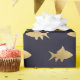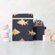 Gift wrap featuring a faux gold fish pattern with a black background.