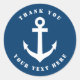 Nautical blue and white ship anchor thank you stickers. Stylish navy blue and white favour stickers and envelope seals. Personalised thank you stickers, save the date label, envelope sealers. Classic maritime logo design. Customisable background colour. Nice for themed wedding party, Birthday, baby shower, bridal shower, engagement, anniversary or Holidays. Great for sailor, skipper, captain, sailing enthusiasts etc. Add your own family name or initials plus established date of marriage. Beach destination wedding accessories and party supplies.