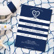 Nautical blue and white wedding invitation. Great for a Navy (military) or lake house wedding. Design features stripes and a heart shaped rope with anchor and couple initials in the middle. Personalise it with your wedding details and send to all of your family and friends.