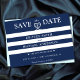 Nautical blue and white wedding save the date card. Great for a Navy (military) or lake house wedding. Design features stripes and a heart shaped rope with anchor and couple initials in the middle. Personalise it with your wedding details and send to all of your family and friends.