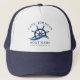 Nautical blue and white hat with a ship helm and ocean waves. Great outfit accessory for a yacht owner or any sailor. Personalise it by adding your name, your boat name and the city you set sail in.