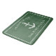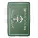 A custom bath mat tailored to the proud boat owner. It features a nautical vintage anchor followed by the boat name and the boat captain's name and the home dock location. All of this sits against a hunter-green backdrop to compliment your bathroom.