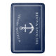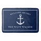 A custom bath mat tailored to the proud boat owner. It features a nautical vintage anchor followed by the boat name and the boat captain name and home dock location.