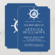 Elegant white nautical boat wheel illustration over navy blue customisable background, birthday party invitation template.