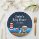 This cute and fun plate features a nautical sailor boy bear on a wooden deck with a seagull and a crab. In the background there is a red and white lighthouse, a cute bird on a sailboat, ocean waves and a navy blue starry night sky. The text combines bold and serif fonts for a stylish and modern look. This is perfect for a nautical themed baby shower.