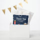 This cute and fun favour bag features a nautical sailor boy bear on a wooden deck with a seagull and a crab. In the background there is a red and white lighthouse, a cute bird on a sailboat, ocean waves and a navy blue starry night sky. The text combines bold and serif fonts for a stylish and modern look. This is perfect for a nautical themed baby shower.