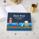 This cute and fun guest book features a nautical sailor boy monkey on a wooden deck with a seagull and a crab. In the background there is a red and white lighthouse, a cute bird on a sailboat, ocean waves and a navy blue starry night sky. The text combines bold and serif fonts for a stylish and modern look. This is perfect for a nautical themed baby shower.