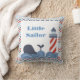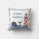 There are many fun elements to this nautical theme kids pillow, starting chevron border in red, blue and grey. The front has a whale swimming in the ocean with a lighthouse next to it. The back has a sailboat and life saver floating in the water with bunting hanging overhead. The front reads Little Sailor and the back says Ahoy! It's a Boy!. Personalise each side with your own wording if you wish. These accent pillows add a nice touch to nautical theme boy's rooms or a baby nursery. ©Cindy Bendel Designs LLC All Rights Reserved.