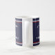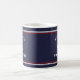 Nautical captain with your name in block text mug navy blue mug with white text, red and white double striped border.