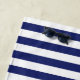 Personalise this nautical Captain's beach towel with your name. Design features a drawing of a navy blue anchor with rope in the centre and navy blue and white stripes above and below.