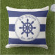 Personalise the boat name and year of establishment on this nautical pillow featuring a navy blue captain's wheel with a circular rope border. Background is blue and white stripes. Back of pillow is navy blue.