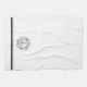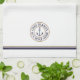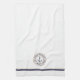 Nautical Chef personalised anchor logo kitchen towel with your name and boat name. White with navy blue and tan brown circle emblem with classic block text. Double navy blue and tan brown lined border.