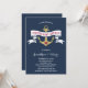 This nautical couples baby shower invitation features a faux gold glitter anchor, a blue and white vintage banner, a cute red heart, and a navy blue background.