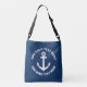 Nautical crossbody bag with custom boat anchor. Personalise with your own text. Navy blue and white design related to boating, sailing, yachting, fishing and more.