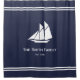 A white sailboat is in the centre of a midnight blue shower curtain. Under the boat, there are two lines for your custom text. The text is white. All text can be edited or deleted.