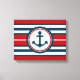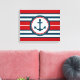 Nautical design with anchor decoration in round shape on red, blue and white striped background