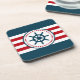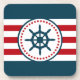 Nautical design with sailing wheel decoration in round shape with stars on red, blue and white striped background