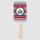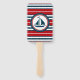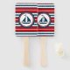 Nautical design with sailing boat decoration in round shape on red, blue and white striped background
