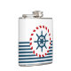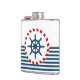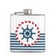 Nautical design with sailing wheel decoration in round shape on blue and white striped background