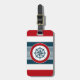 Nautical design with compass decoration in round shape on blue, red and white striped background