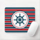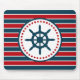 Nautical design with sailing wheel decoration in round shape with stars on red, blue and white striped background