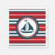 Nautical design with sailing boat decoration in round shape on red, blue and white striped background