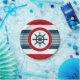 Nautical design with sailing wheel decoration in round shape on blue, red and white striped background