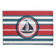 Nautical design with sailing boat decoration in round shape on red, blue and white striped background