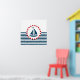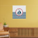 Nautical design with sailing boat decoration in round shape on blue and white striped background
