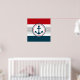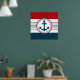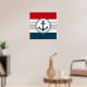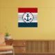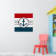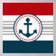 Nautical design with anchor decoration in round shape on blue, red, grey and white striped background