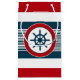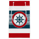 Nautical design with sailing wheel decoration in round shape on blue, red and white striped background
