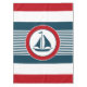 Nautical design with sailing boat decoration in round shape on blue, red and white striped background
