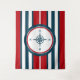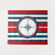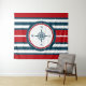 Nautical design with compass decoration in round shape on red, blue and white striped background