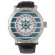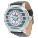 Nautical design with sailing wheel decoration in round shape on blue and white striped background