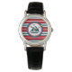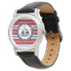 Nautical design with sailing boat decoration in round shape on red, blue and white striped background